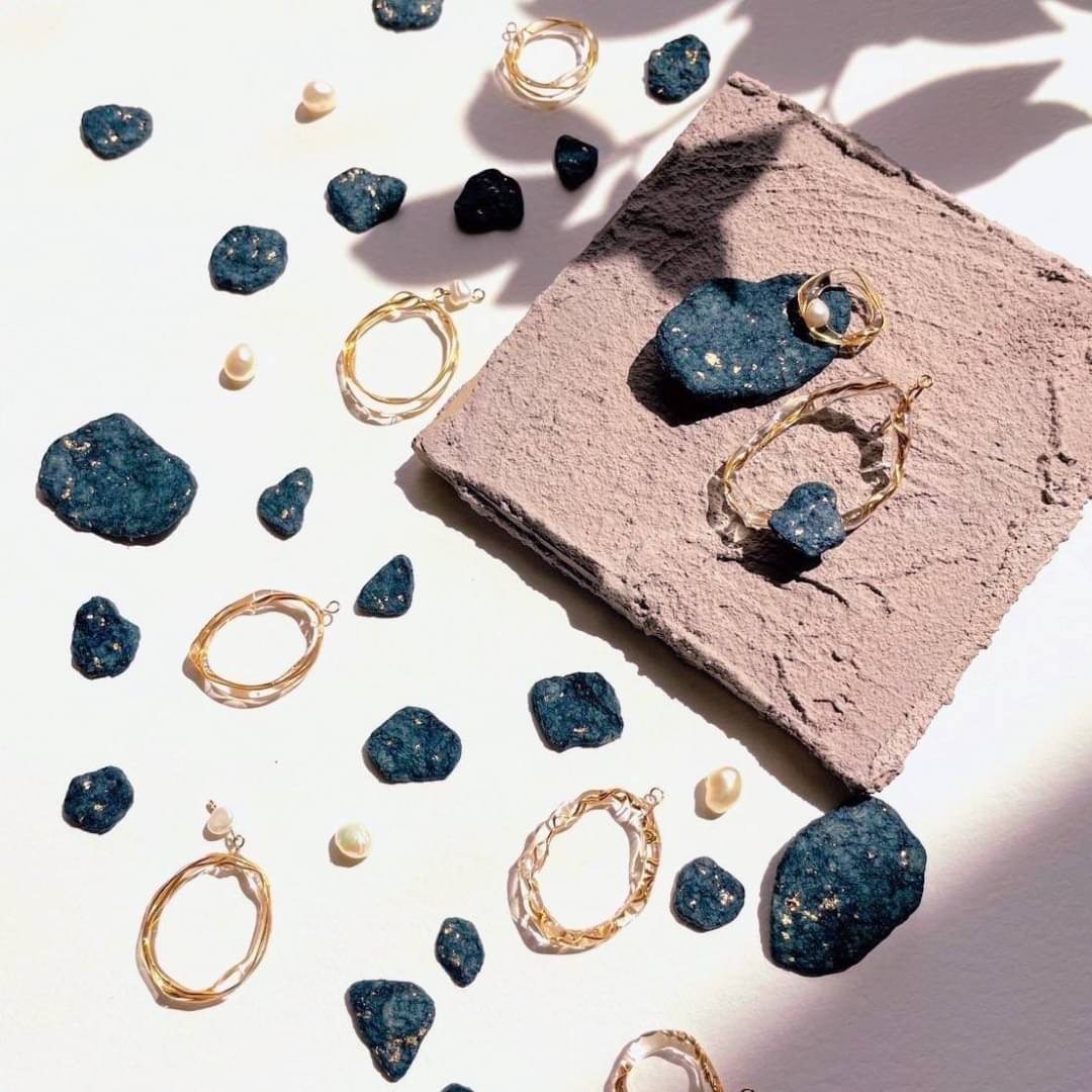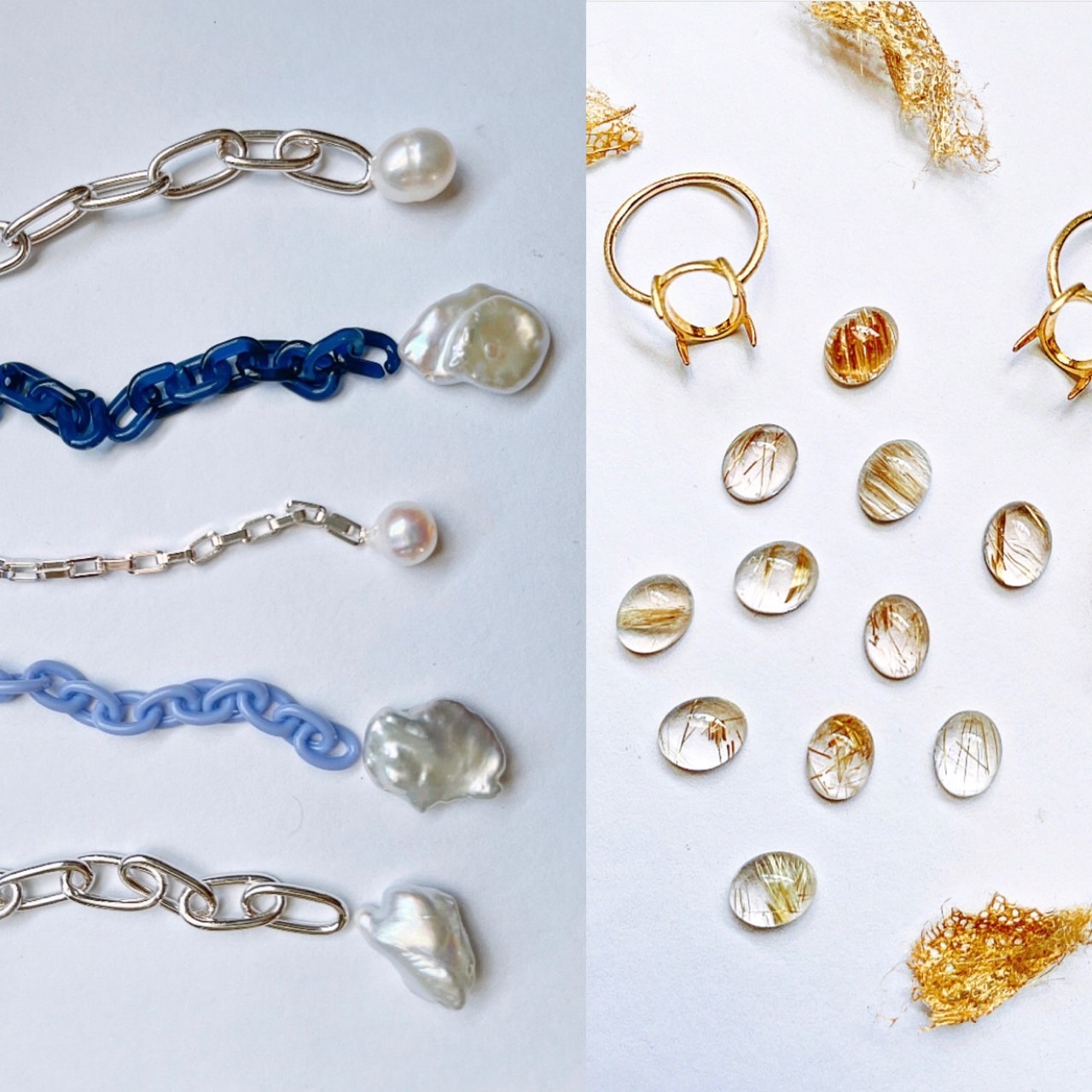 今回はパール×チェーンの耳もとアクセサリー、または鉱物図鑑のような天然石ルチルクォーツを使ったリングづくりワークショップを開催。